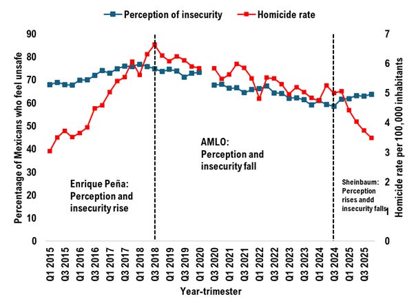 For nearly a decade, Mexico followed a grim logic. When homicides increased, people felt less safe. When violence receded, public anxiety eased. The two indicators moved together, almost mechanically, from 2015 onward. That pattern broke just months after President Claudia Sheinbaum took office in October 2024. Since January 2025, Mexico’s homicide rate has fallen while the share of people who say they feel unsafe has climbed. The question is what’s behind this change.